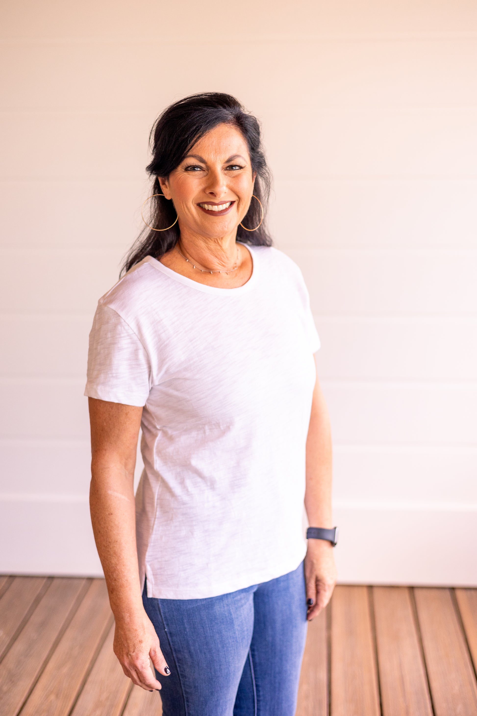 This tee is both super comfy and stylish. With side vents and slightly longer in length in the back. Its the perfect everyday tee that flatters your figure without being to tight or boxy