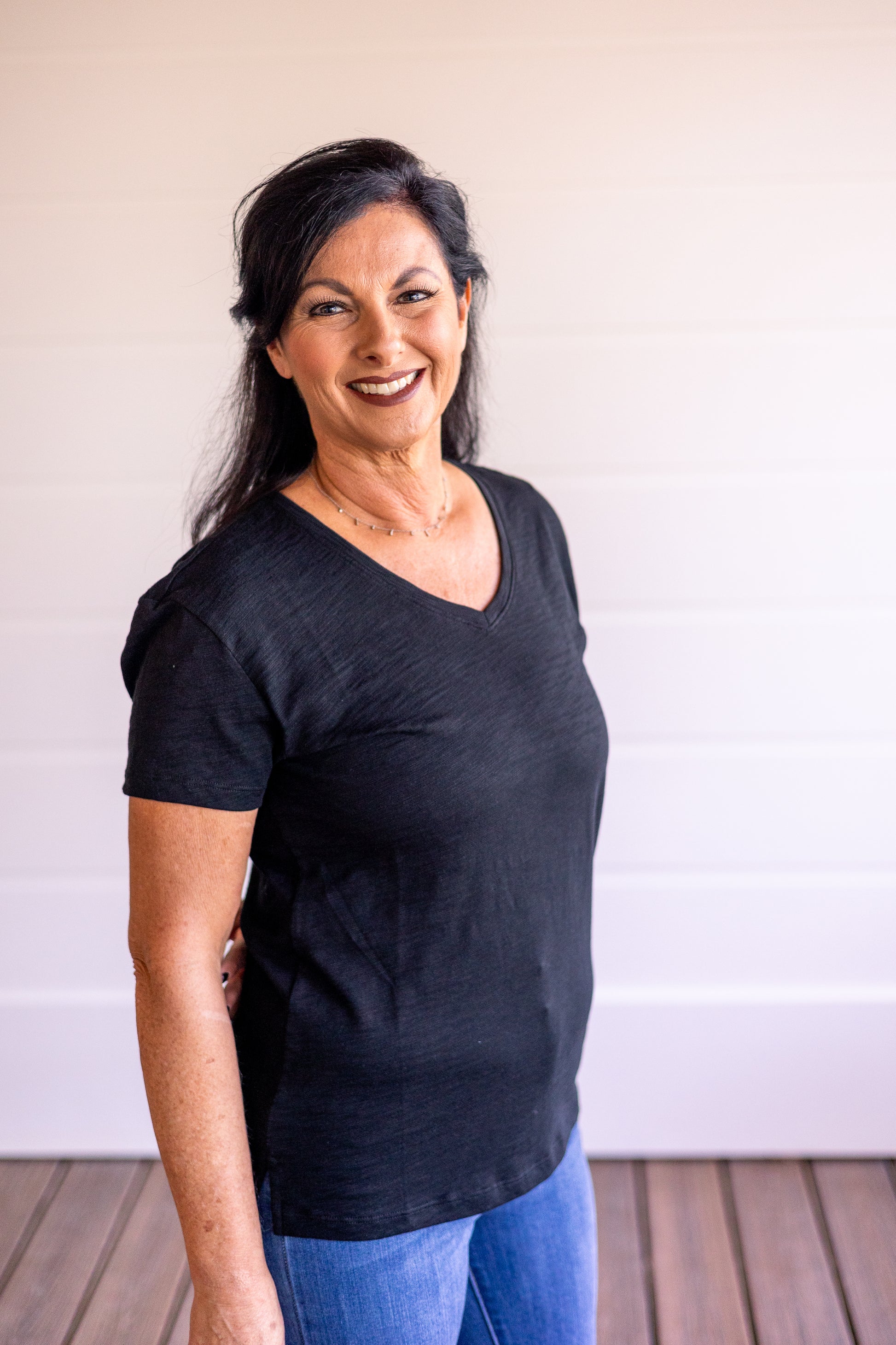 The perfect basic Jeans Tee. Super comfy and stylish. side vents with slightly longer length in back. Typical t-shirt length with high low hem.